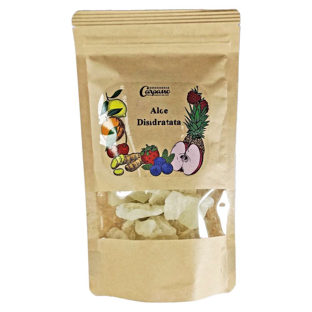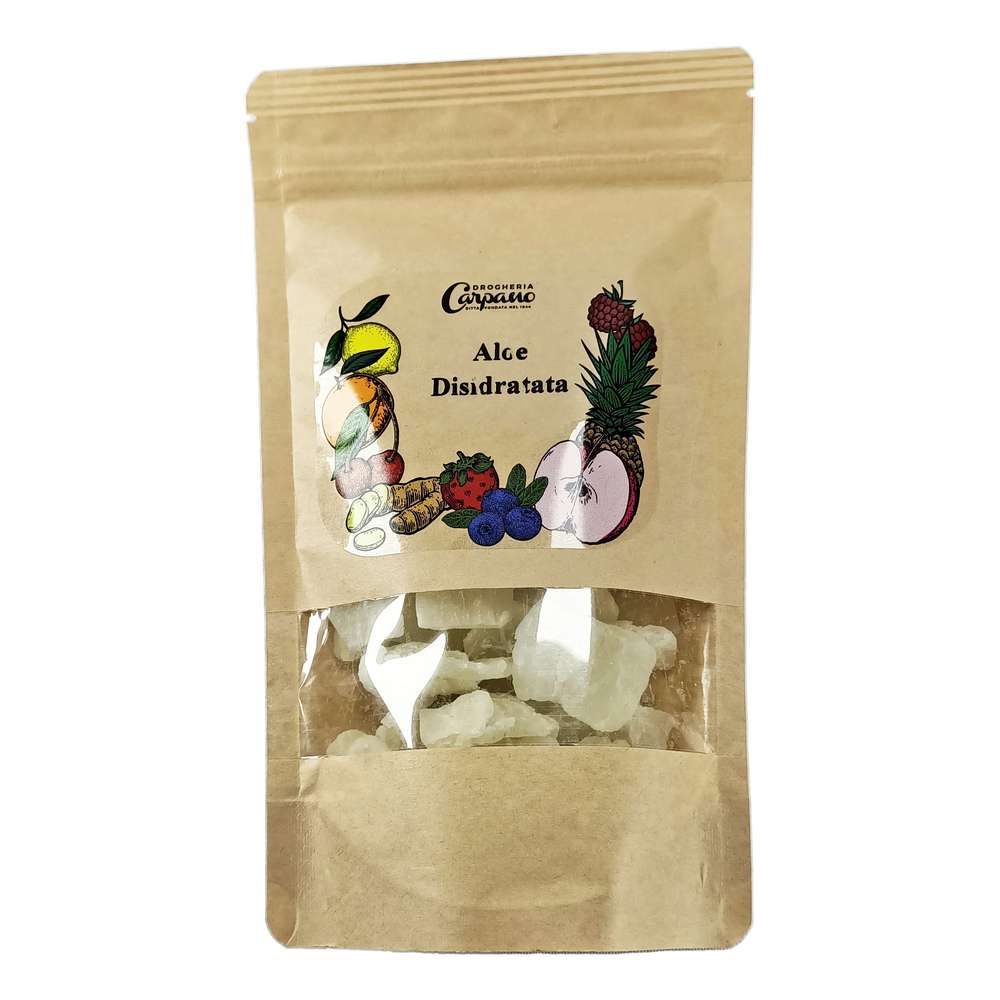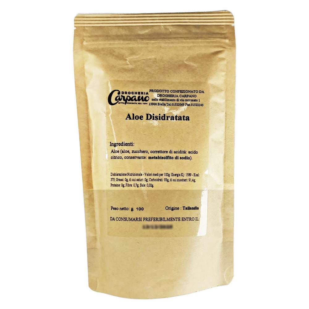 Aloe disidratato a fettine 100g; Ingredienti: Aloe (aloe, zucchero, correttore di aciditĂ : acido citrico, conservante: metabisolfito di sodio).