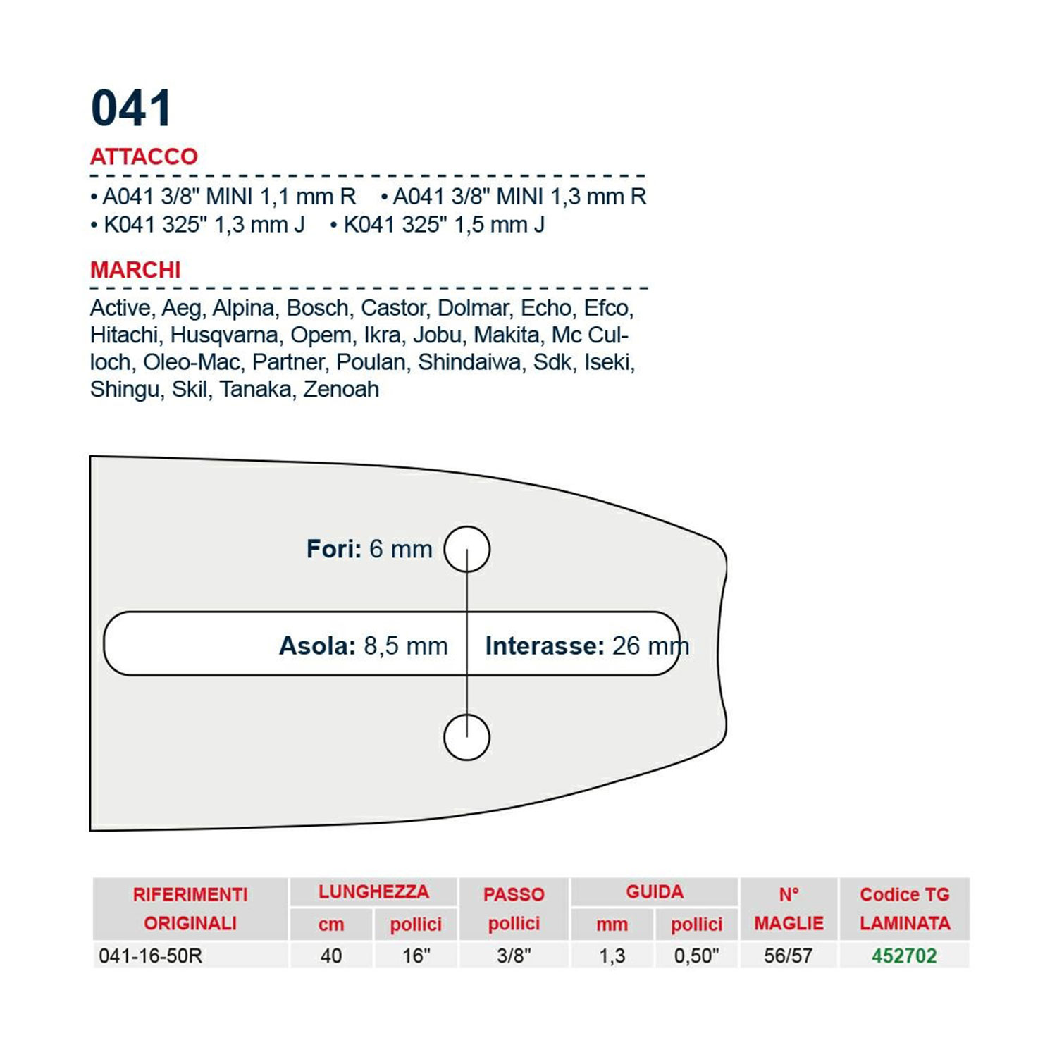 Barra motosega 40 cm – 16″ passo 3/8″ Spessore 1.3 mm – .050″ attacco 041 – 452702