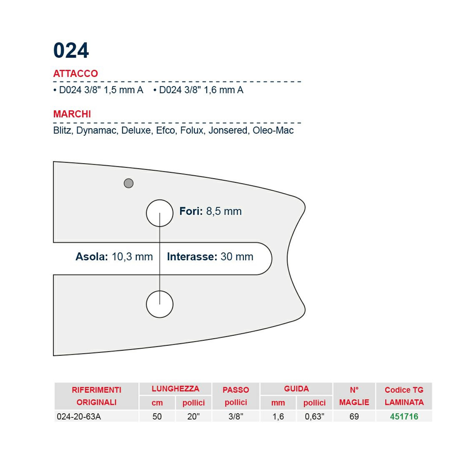 Barra 50 cm – 20″ passo 3/8″ Spessore 1.6 mm – .063″ attacco 024