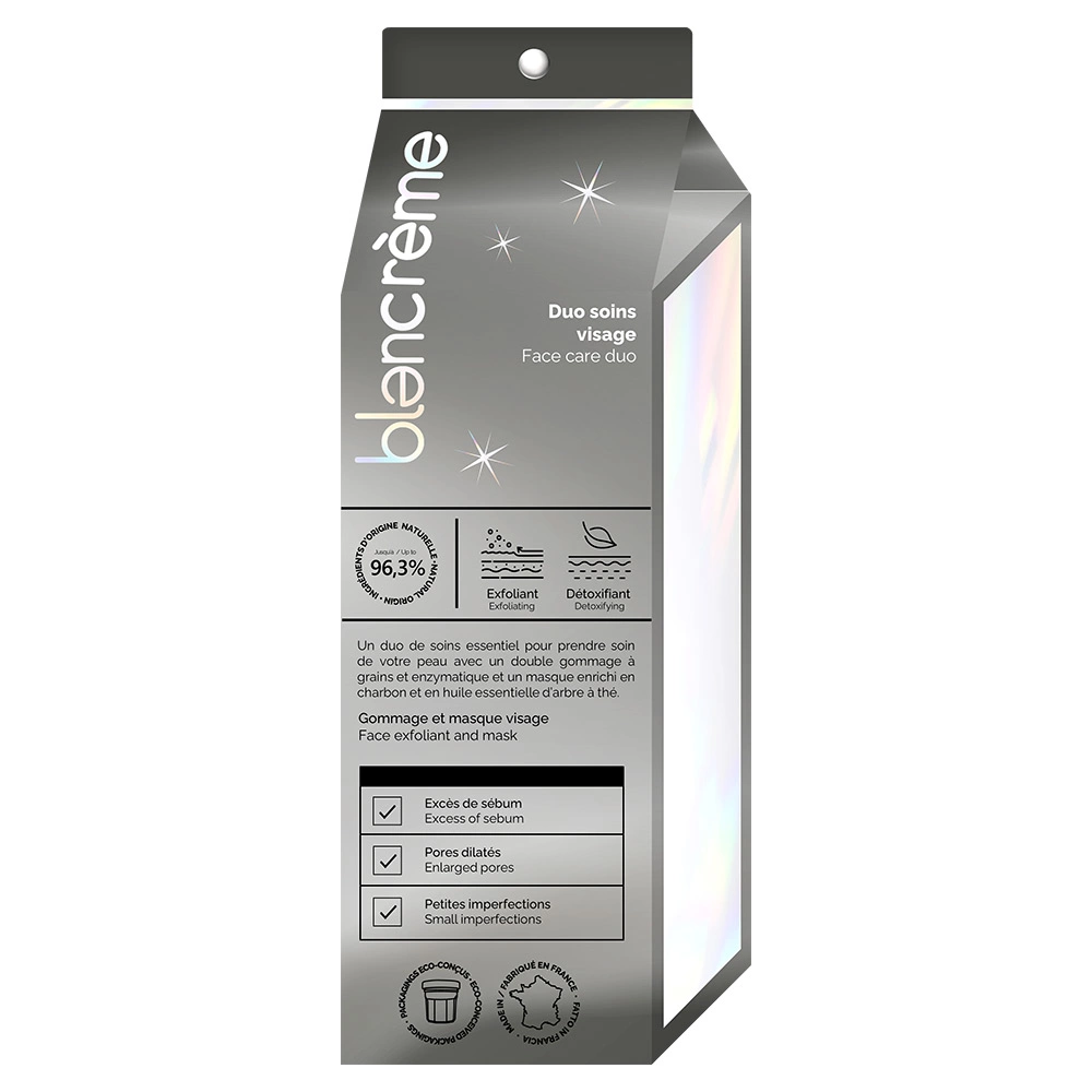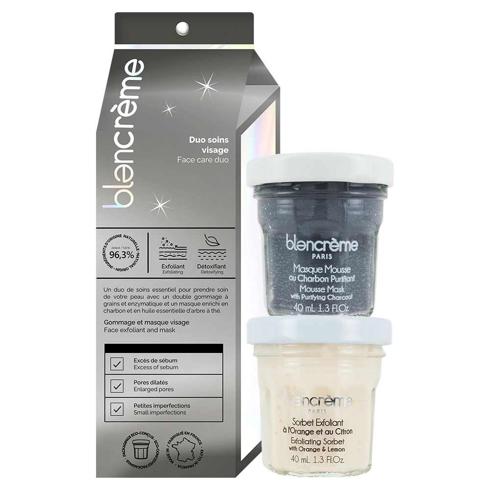Questo berlingotto contiene una routine per la cura del viso da eseguire una volta alla settimana. Il sorbetto all’arancia e al limone consente una doppia esfoliazione. La maschera viso carbobe è un trattamento purificante e detossidante. I suoi pincipi attivi del carbone Bincho-Tan e olio essenziale di tea tree assorbono le impurità e lasciano la pelle disintossicata. Contiene: