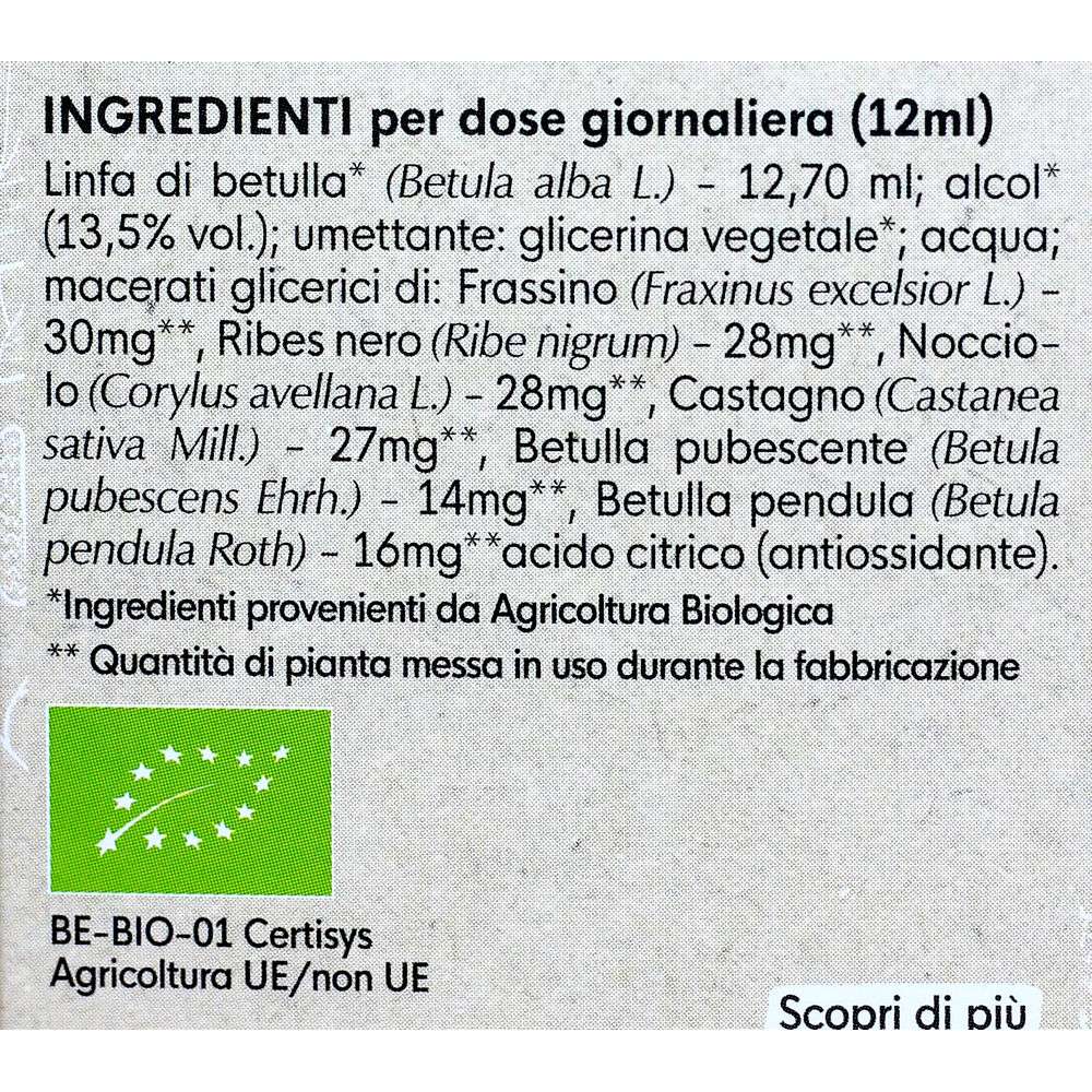 Linfa di betulla* (Betula alba L.) – 12,70 ml; alcol* (13,5% vol.); umettante: glicerina vegetale*; acqua;