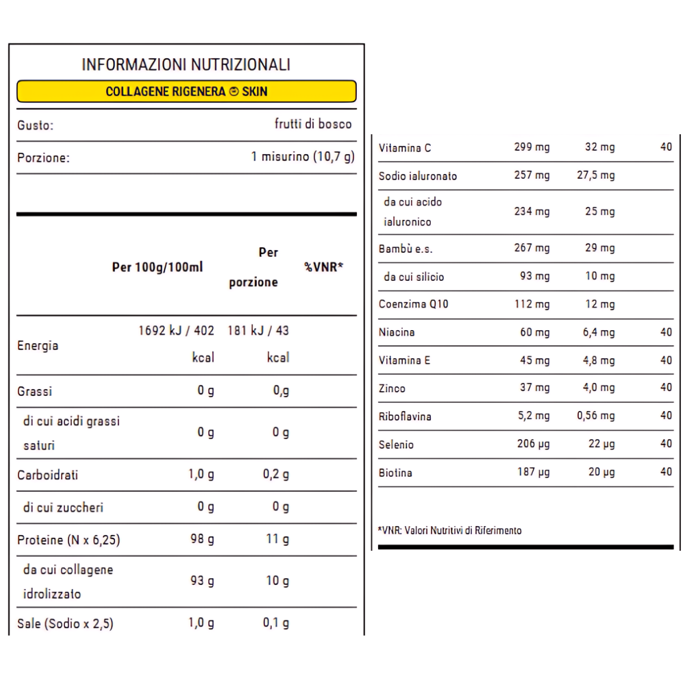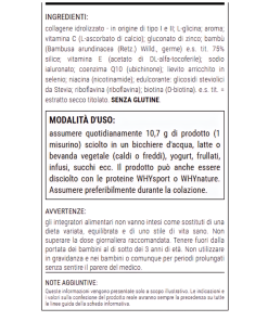 collagene idrolizzato – in origine di tipo I e II; L-glicina; aroma; vitamina C (L-ascorbato di calcio); gluconato di zinco; bambù (Bambusa arundinacea (Retz.) Willd., germe) e.s. tit. 75% silice; vitamina E (acetato di DL-alfa-tocoferile); sodio ialuronato; coenzima Q10 (ubichinone); lievito arricchito in selenio; niacina (nicotinamide); edulcorante: glicosidi steviolici da Stevia; riboflavina (riboflavina); biotina (D-biotina). e.s. tit. = estratto secco titolato. SENZA GLUTINE.