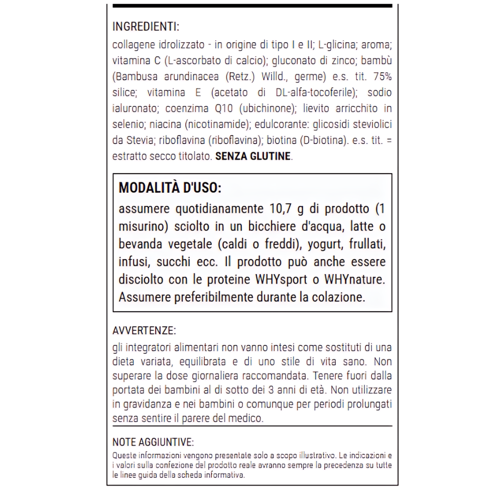 - Collagene idrolizzato (tipo I e II): È il componente principale di questo integratore. Il collagene è una proteina fondamentale per la struttura della pelle, dei capelli e delle unghie. Essendo idrolizzato, viene assorbito più facilmente dall’organismo. WHYNATURE whynature why nature