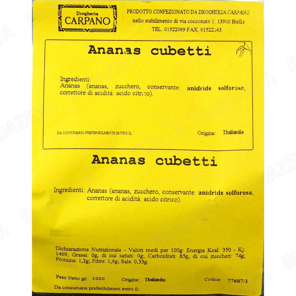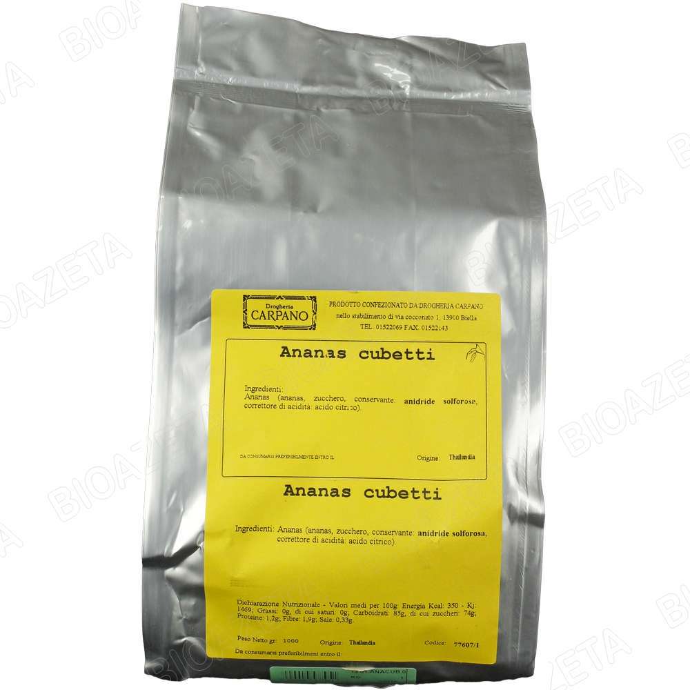 Cubetti ananas 1kg Carpano; Deliziosa frutta disidratata. Ottenuti con procedimento artigianale. Sono l’ispirazione perfetta per tutti i tipi di dolci preparati in casa, dai piĂą semplici come i biscotti, i classici ciambelloni, i plumcake e i muffin, a ogni genere di torta fino alle specialitĂ complesse e elaborate della tradizione. Il loro gusto sapido rende speciale ogni preparazione, mescolati nell’impasto o utilizzati come completamento della decorazione finale. Sono squisiti anche miscelati allo yogurt, un dessert di grande effetto e goloso. E perchĂ© non utilizzarli anche per personalizzare il gelato, o per rendere piĂą sfiziosa la macedonia?