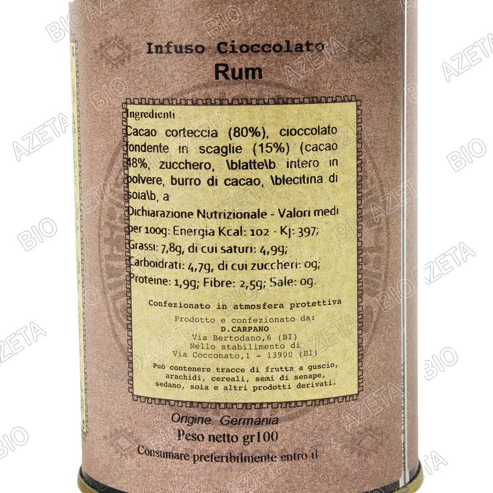 Infuso Cacahuatl cioccolato e rum; Due sapori intensi, un binomio perfetto per un risultato davvero piacevole al palato. Il profumo speziato del rum si ammorbidisce grazie alle note aromatiche del cioccolato, amalgamandosi armoniosamente in un gusto squisitamente esotico. Ingredienti: Cacao corteccia (80%), cioccolato fondente in scaglie (15%) (cacao 48%, zucchero, latte intero in polvere, burro di cacao, lecitina di soia, aroma naturale di vaniglia), fiori di cactus, aromi.