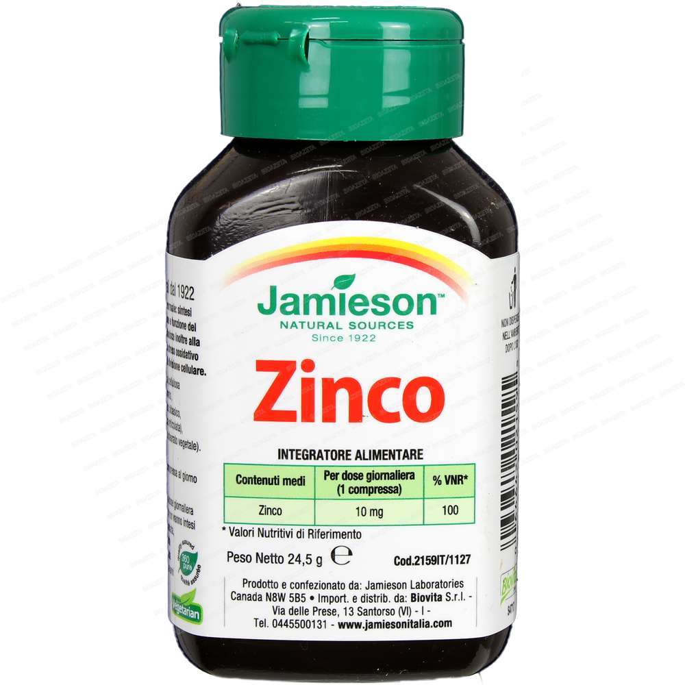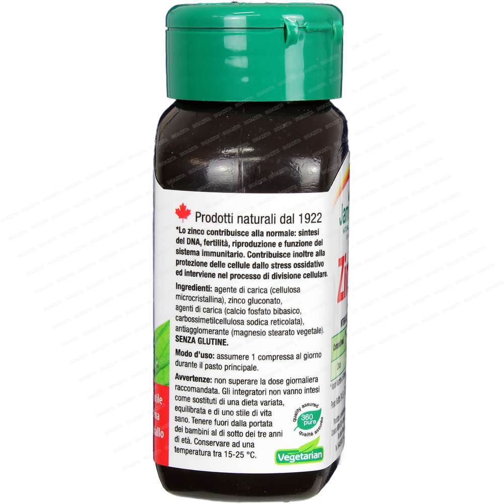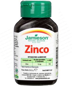 Integratore alimentare di zinco il quale è utile per la normale funzione del sistema immunitario e per la protezione dallo stress ossidativo. Lo zinco è un minerale traccia essenziale presente in ogni cellula dell’organismo che influisce su un gran numero di reazioni enzimatiche. Lo zinco è coinvolto nella sintesi di DNA e proteine, contribuisce alla normale funzione del sistema immunitario e alla protezione delle cellule dallo stress ossidativo. Zinco di Jamieson è formulato utilizzando zinco gluco- nato organico, una delle forme maggiormente assimilabili dall’organismo.. 1 compressa al giorno durante il pasto principale.