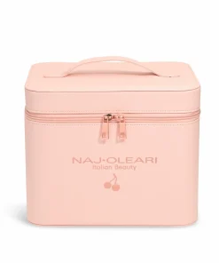 L’elegante beauty case in colore rosa effetto saffiano è impreziosito con logo e ciliegia dorati.