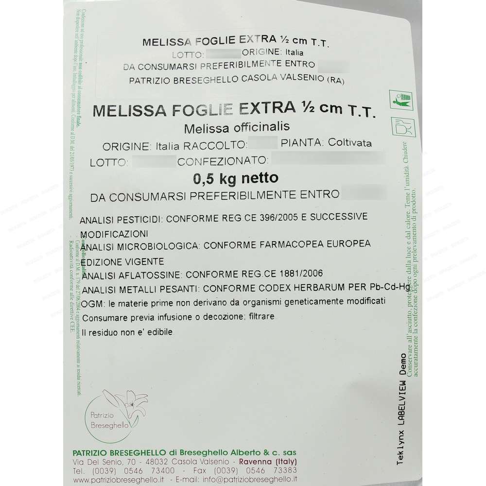 Melissa foglie extra 1/2 cm Taglio Tisana 500g, La Patrizio Breseghello, azienda di importazione, lavorazione e commercializzazione di piante, ha la propria sede a Casola Valsenio, in provincia di Ravenna; il “paese delle erbe e dei frutti dimenticati”, dove 450 specie di piante officinali, fanno bella mostra di se in un Giardino delle Erbe. Fra i fattori differenziali e distintivi dell’ azienda vi sono l’approvvigionamento diretto delle materie prime (quando possibile) allo scopo di accorciare la filiera; Le tecniche di lavorazione e conservazione finalizzate all’inalterabilità dei principi attivi; la doppia cernitura (meccanizzata e a mano); la totale assenza di aromi nelle basi composte: spesso utilizzati per conferire gradevolezza al prodotto. Tutti i prodotti (piante officinali, tè e infusi, vegetali in polvere, tisane confezionate e altro), vengono controllati da un laboratorio di analisi prima di essere immessi nel mercato. Sono oltre 200 le specie botaniche selezionate e lavorate dalla Patrizio Breseghello. Ogni fase della trasformazione è condotta con la massima cura e attenzione e ha lo scopo di ottenere il miglior taglio tisana reperibile sul mercato. La cernitura a mano, tratto distintivo dell’azienda, viene effettuata successivamente a quella meccanica con l’obiettivo di rendere ancora più puro il prodotto e distinguibili gli elementi vegetali adeguatamente sminuzzati (foglie, radici, fiori, cortecce). Questa operazione permette di liberare il preparato da ogni impurità ed eventuali scorie estranee alla pianta, consentendo al cliente il triplo beneficio di una formulazione buona, naturale ed efficace. La Patrizio Breseghello attraverso il proprio laboratorio di ricerca e una conoscenza a 360 gradi delle specie vegetali utilizzate, ha ideato una linea di basi composte rispondenti alle più comuni necessità. La composizione di una tisana è una scienza! Tutte le basi di erbe aromatiche ovviamente naturali e prive di organismi geneticamente modificati, possono essere consumate anche come tisane fredde mantenendo inalterate le proprietà.