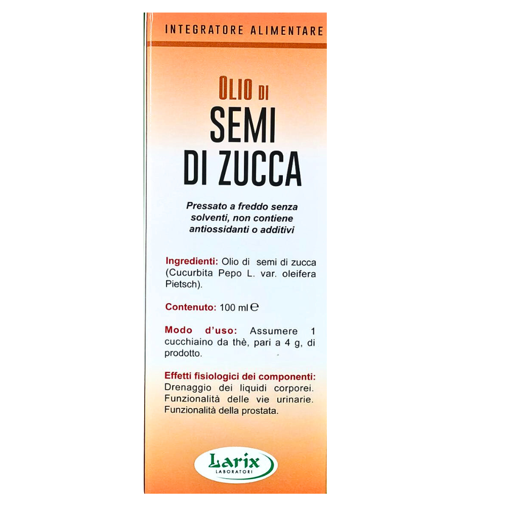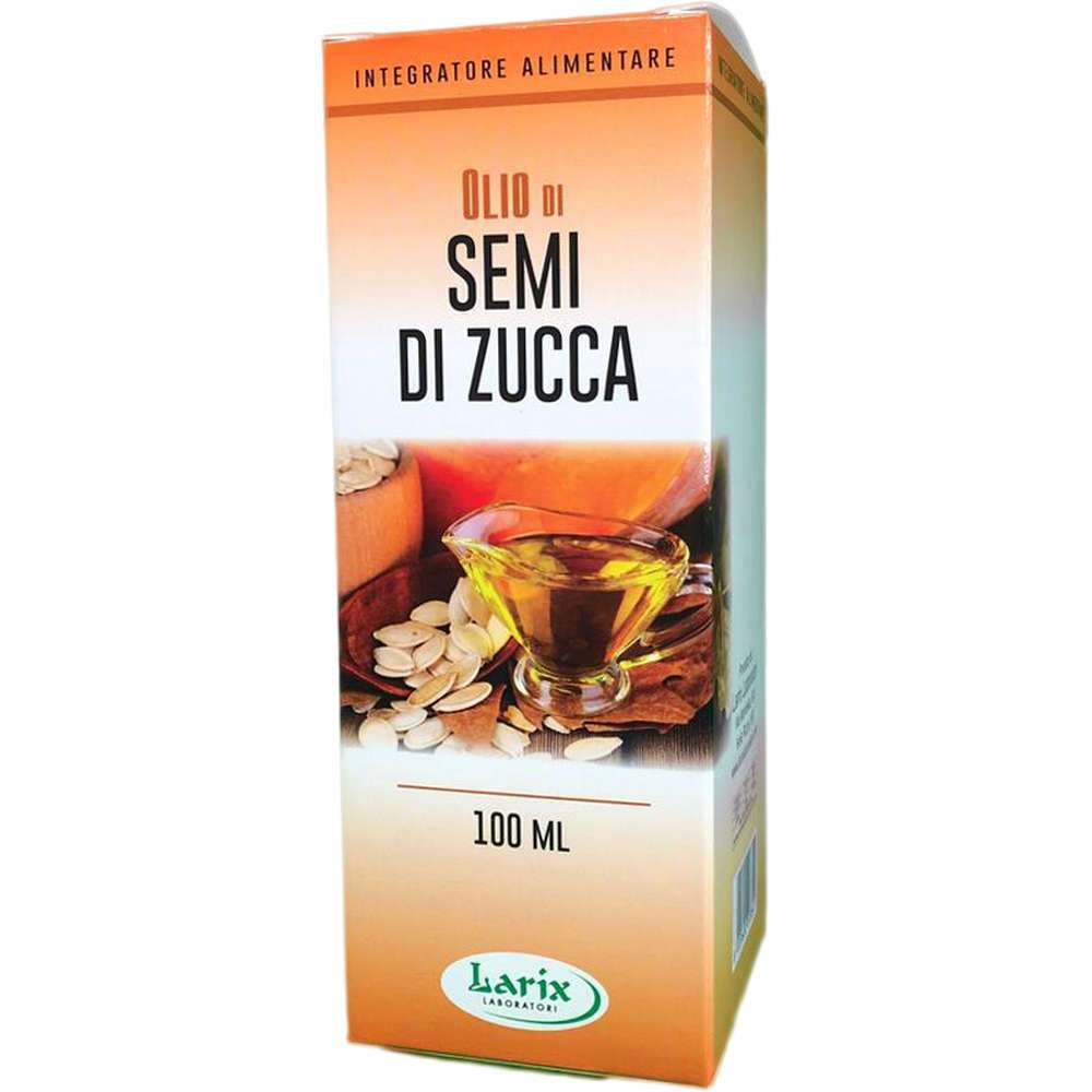 Olio Semi di Zucca Alimentare/Cosmetico 100ml Larix; Drenaggio dei liquidi corporei, funzionalitĂ delle vie urinarie e funzionalitĂ della prostata. Ricco di acidi grassi essenziali, utile nella prevenzione delle malattie cardiovascolari. Integratore alimentare a base di olio di semi di zucca.