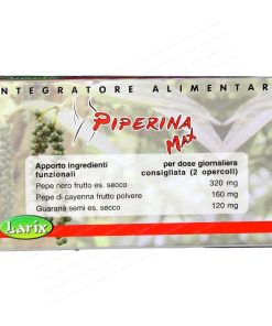 Piperina max 60 capsule Larix contiene Pepe nero titolato in Piperina, utile per combattere efficacemente tessuto adiposo e cellulite, Pepe di cayenna utile come coadiuvante dello stimolo del metabolismo e GuaranĂ , utile per sostenere il metabolismo dei lipidi e l’equilibrio del peso corporeo.
