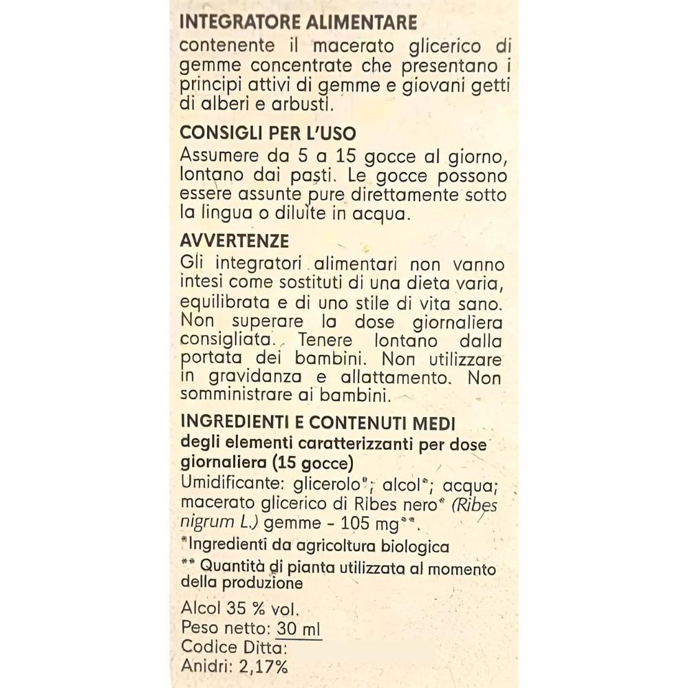 contenente il macerato glicerico di gemme concentrate che presentano i principi attivi di gemme e giovani getti di alberi e arbusti.