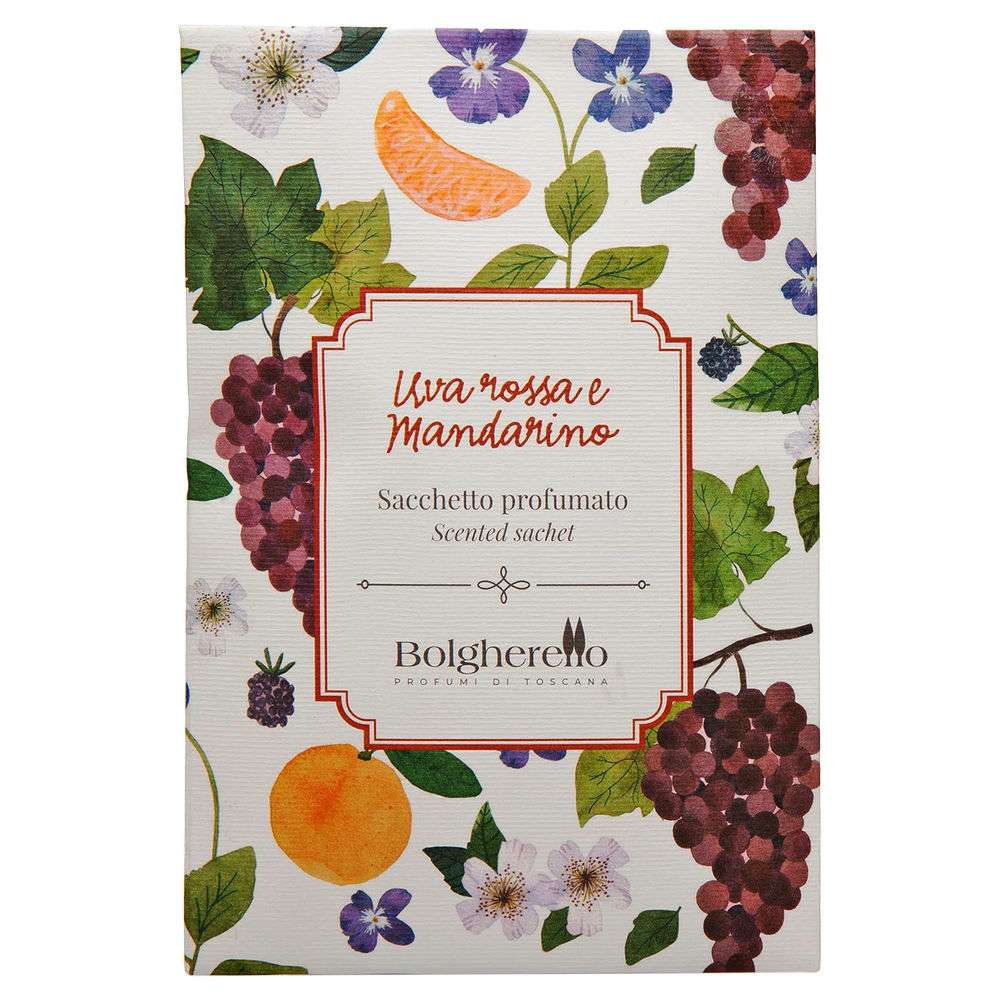 Sacchetto profumato Uva Rossa e Mandarino; Una fragranza dal carattere deciso, pensata per trasportare la mente di coloro che la utilizzano nel cuore delle cantine toscane, dove l’odore intenso dell’uva appena spremuta vi fa da padrona. Il sacchetto profumato rappresenta una versatile soluzione per profumare i propri cassetti, allontanando eventuali odori sgradevoli. Il guardaroba sarà pervaso da una piacevole e leggera sensazione di freschezza, semplicemente inserendovi il sacchetto all’interno.
