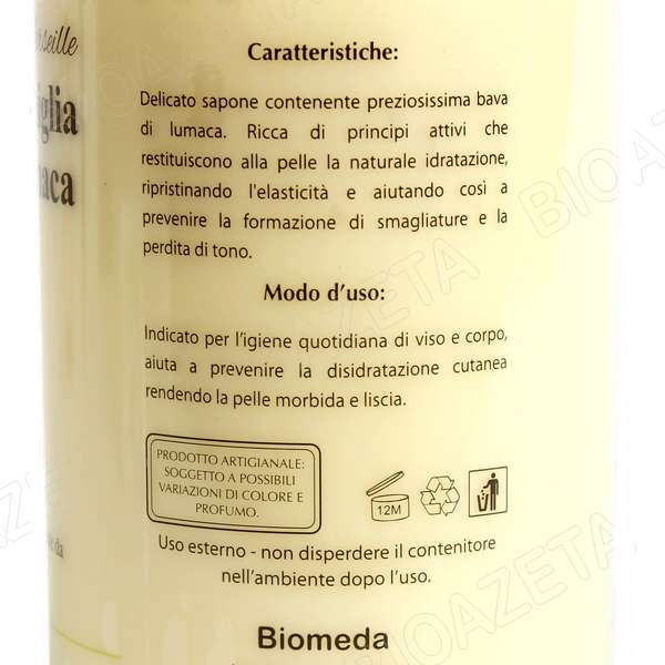 Sapone di Marsiglia alla bava di lumaca 1L Biomeda; Viso e Corpo, Delicato sapone contente preziosissima Bava di Lumaca. Ricca di principi attivi che restituiscono alla pelle la naturale idratazione, ripristinando l’elasticità e aiutando così a prevenire la formazione di smagliature e la perdita di tono.