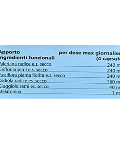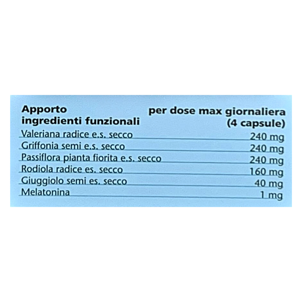 Ingredienti: Valeriana (Valeriana officinalis L.) radice es. secco 0,42% ac. valerenici, Griffonia (Griffonia simplicifolia (DC) Baill.) semi es. secco 20% 5- HTP, Passiflora (Passiflora incarnata L.) pianta fiorita es. secco 3,5% vitexina, Rodiola (Rhodiola rosea L.) radice es. secco 3% Rosavin, Giuggiolo (Ziziphus Jujuba Miller) semi es. secco, Cellulosa microcristallina, Melatonina. Capsula: gelatina vegetale.