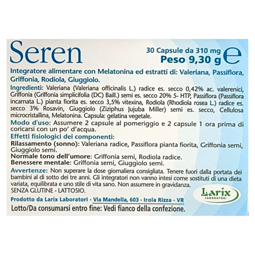 Seren 30 capsule Larix; Complesso rasserenante. Integratore alimentare con Melatonina ed estratti di: Valeriana, Passiflora, Griffonia, Rodiola, Giuggiolo.