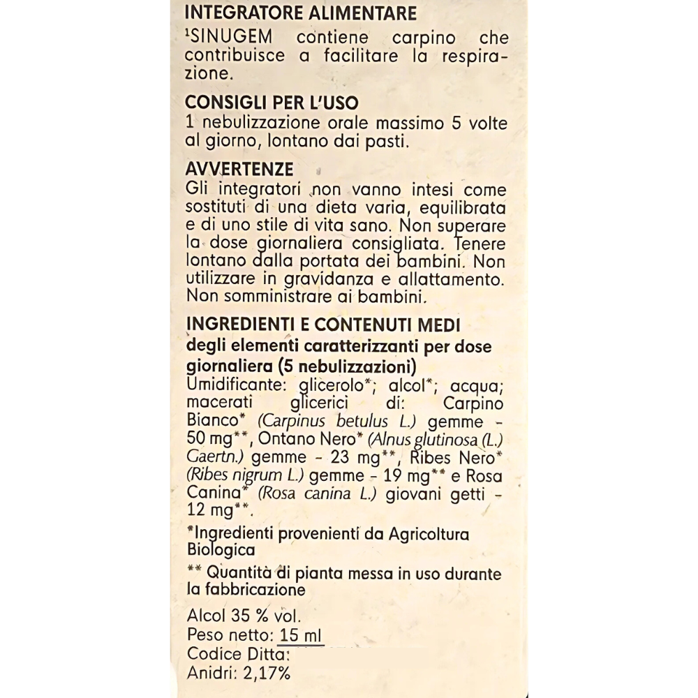 Sinugem Bio spray Herbalgem 15ml; SINUGEM contiene carpino che contribuisce a facilitare la respirazione.