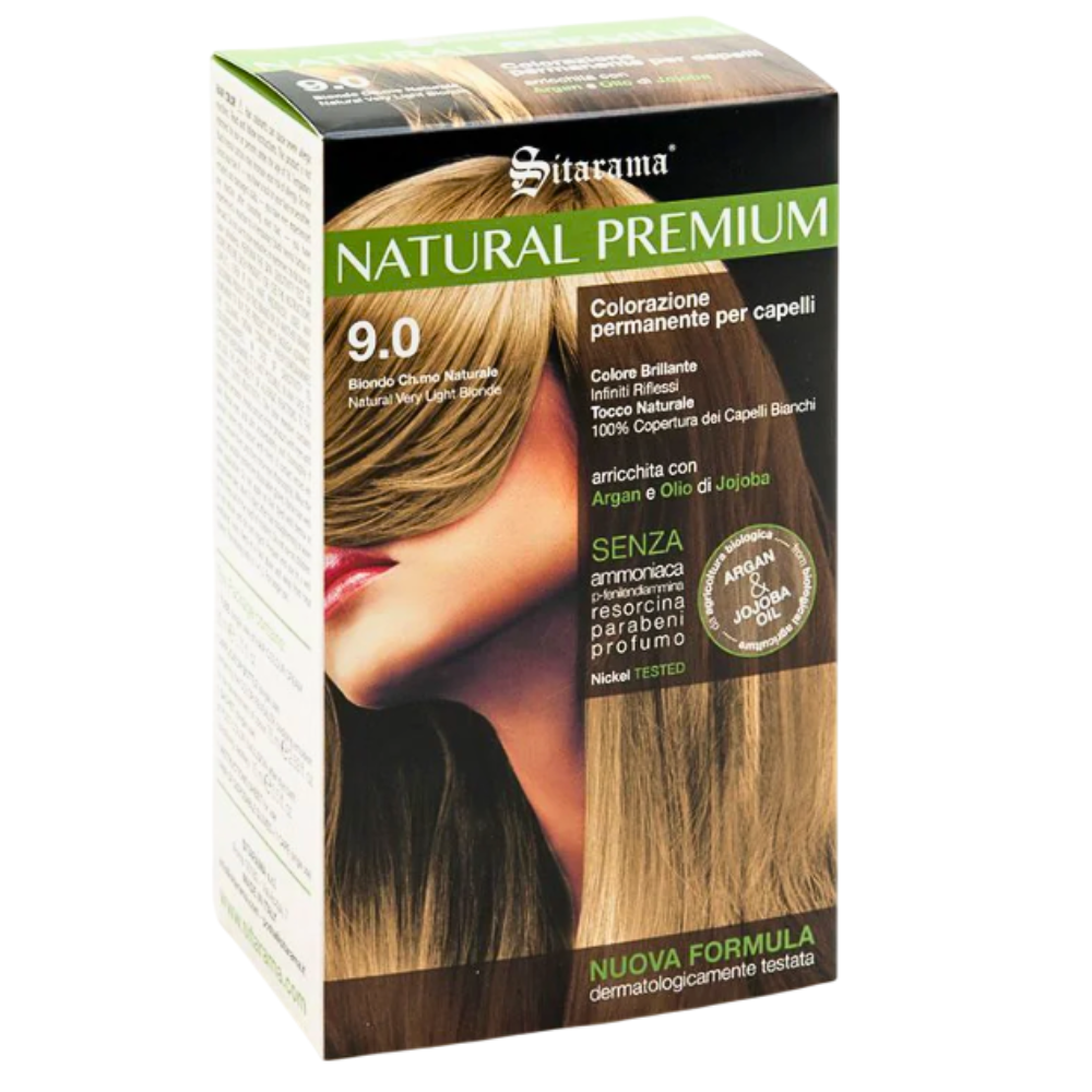 Sitarama Natural Premium 9.0 Biondo chiarissimo; Colorazione permanente per capelli. Colori brillanti. Infiniti riflessi.100 %Tocco naturale. 100% Copertura dei capelli bianchi. Formula arricchita con Argan e Olio di Jojoba da agricoltura biologica. Senza ammoniaca, p-fenilendiammina, resorcina, parabeni e profumo. Nickel tested.