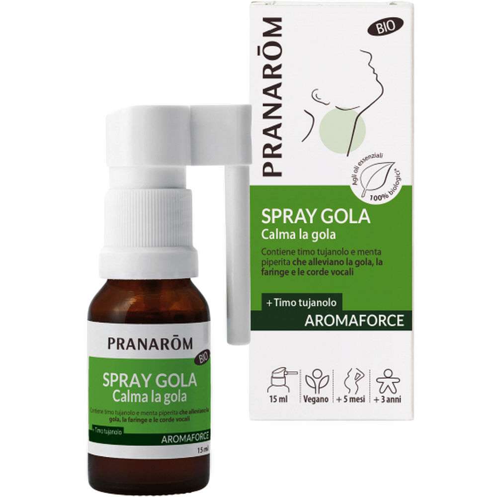 Spray Gola Bio Pranarom; Formato da 15ml. Contiene menta piperita che allevia la gola, la faringe e le corde vocali.