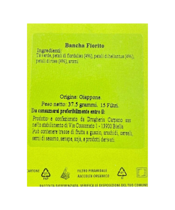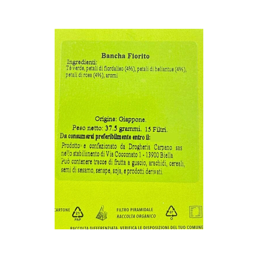 Tè Bancha Fiorito 15 filtri piramidali Carpano; Ingredienti: Tè Verde Bancha Giapponese, petali di Fiordaliso (4%), petali di Heliantus (4%), petali di Rosa (4%), aromi.