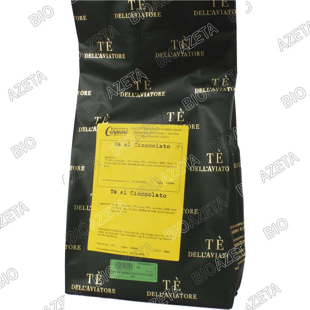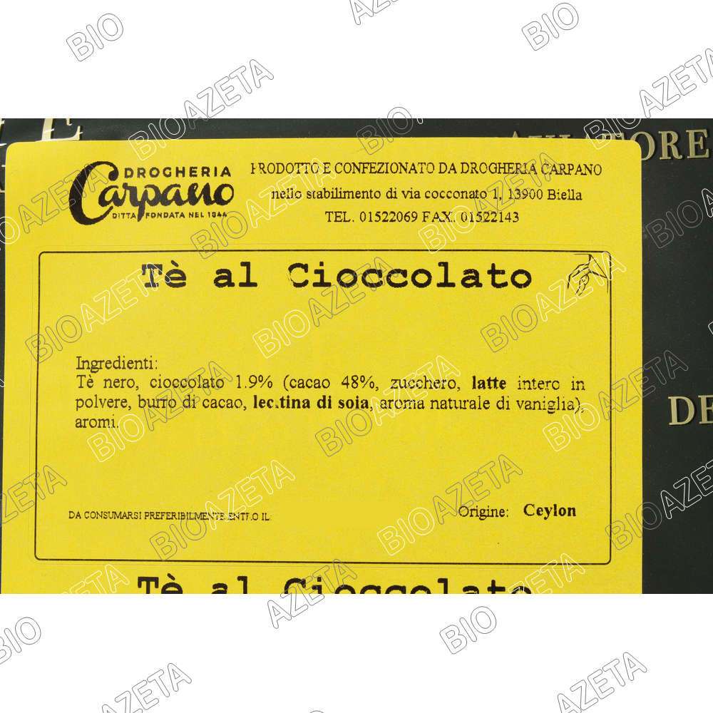 Tè nero al Cioccolato; Ingredienti: Miscela di Tè nero Ceylon con pezzetti di Cioccolato 1,9% (cacao 48%, zucchero, latte intero in polvere, burro di cacao, lecitina di soia, aroma naturale di vaniglia), aromi. Incuriosisce e piace molto questo tè di Ceylon accompagnato da golosi pezzetti di cioccolato fondente. Ottimo per colazioni e merende.